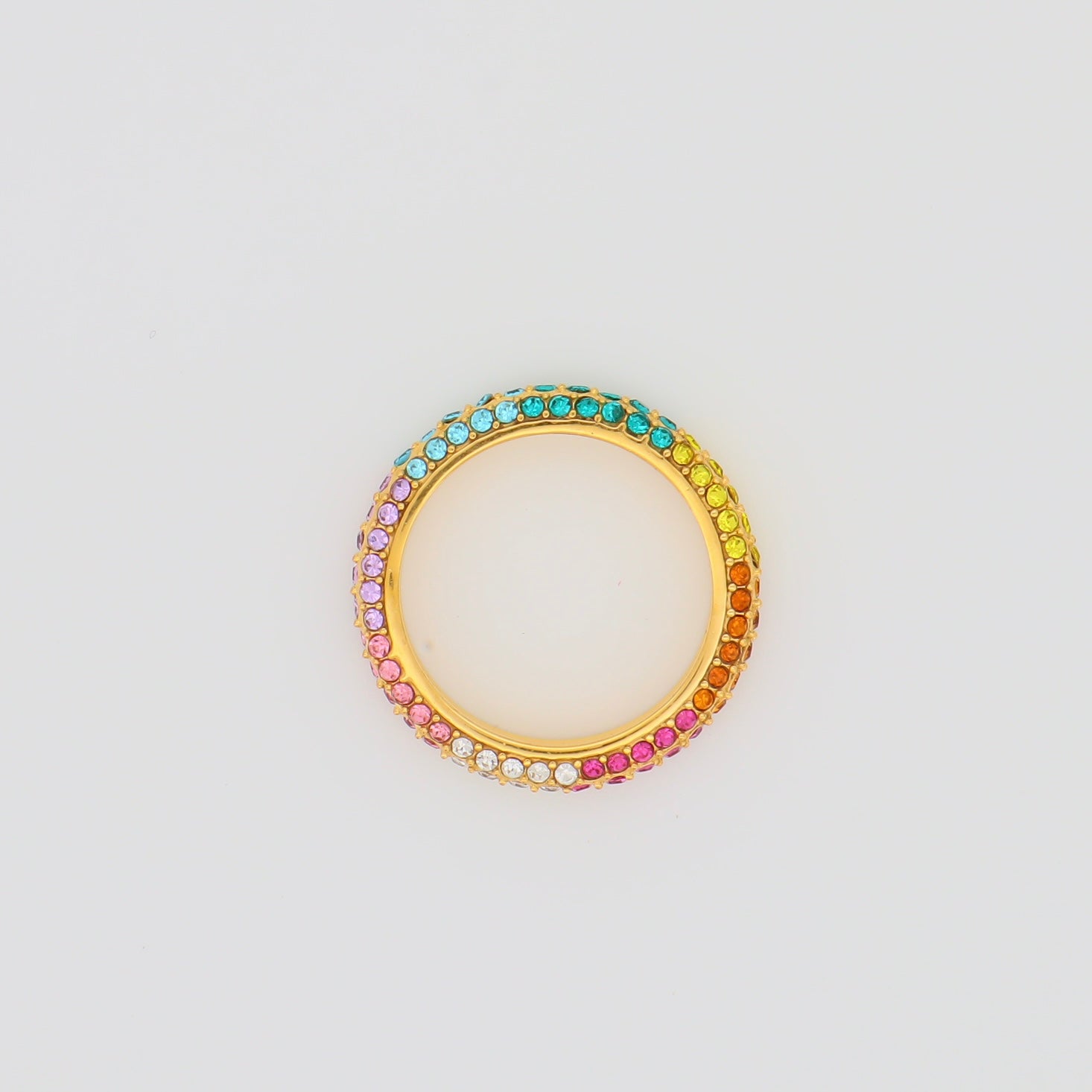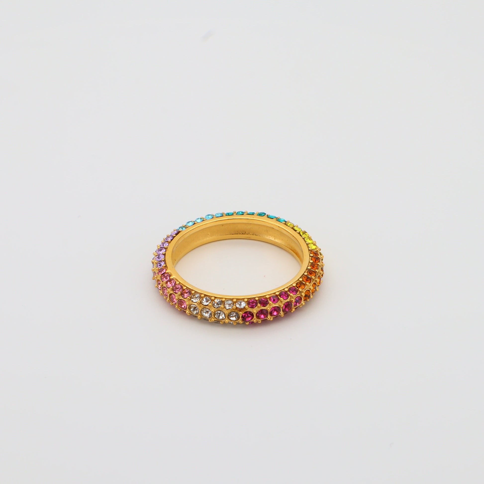 Rainbow ring, med matchende øredobber, vil være det perfekte fargerike tilbehøret i sommer! Laget av gullforgylt rustfritt stål, og fargerike zirconstener.